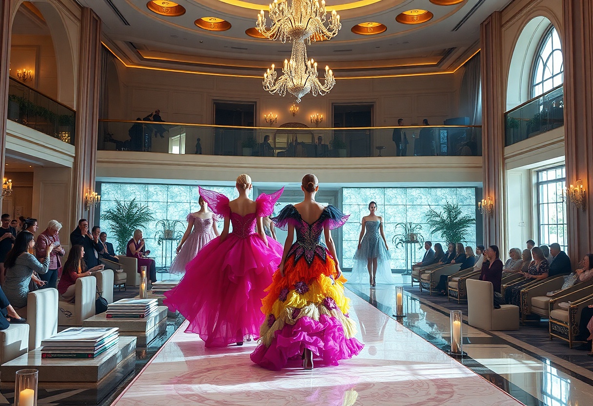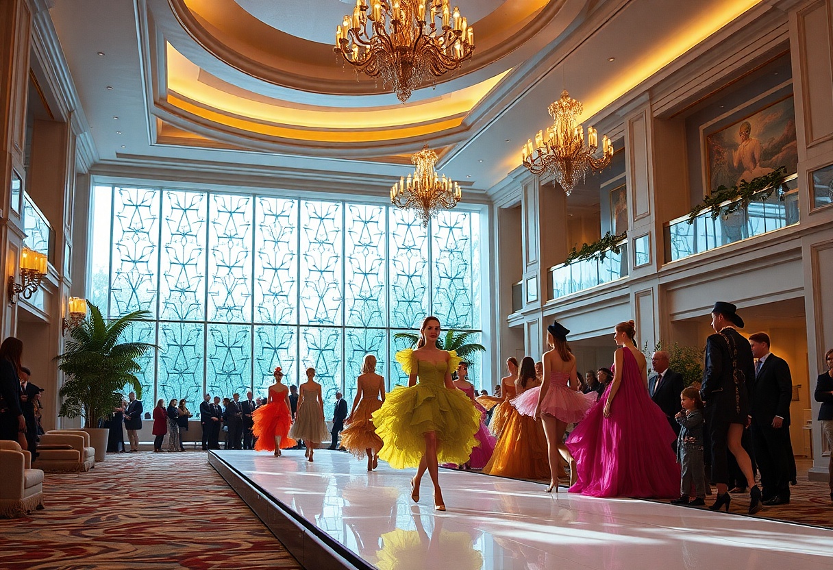 Modelka zamotaná v několika vrstvách průsvitného zeleného „nic“ proplouvala po vyvýšené stříbrné lávce umístěné mezi stoly.
