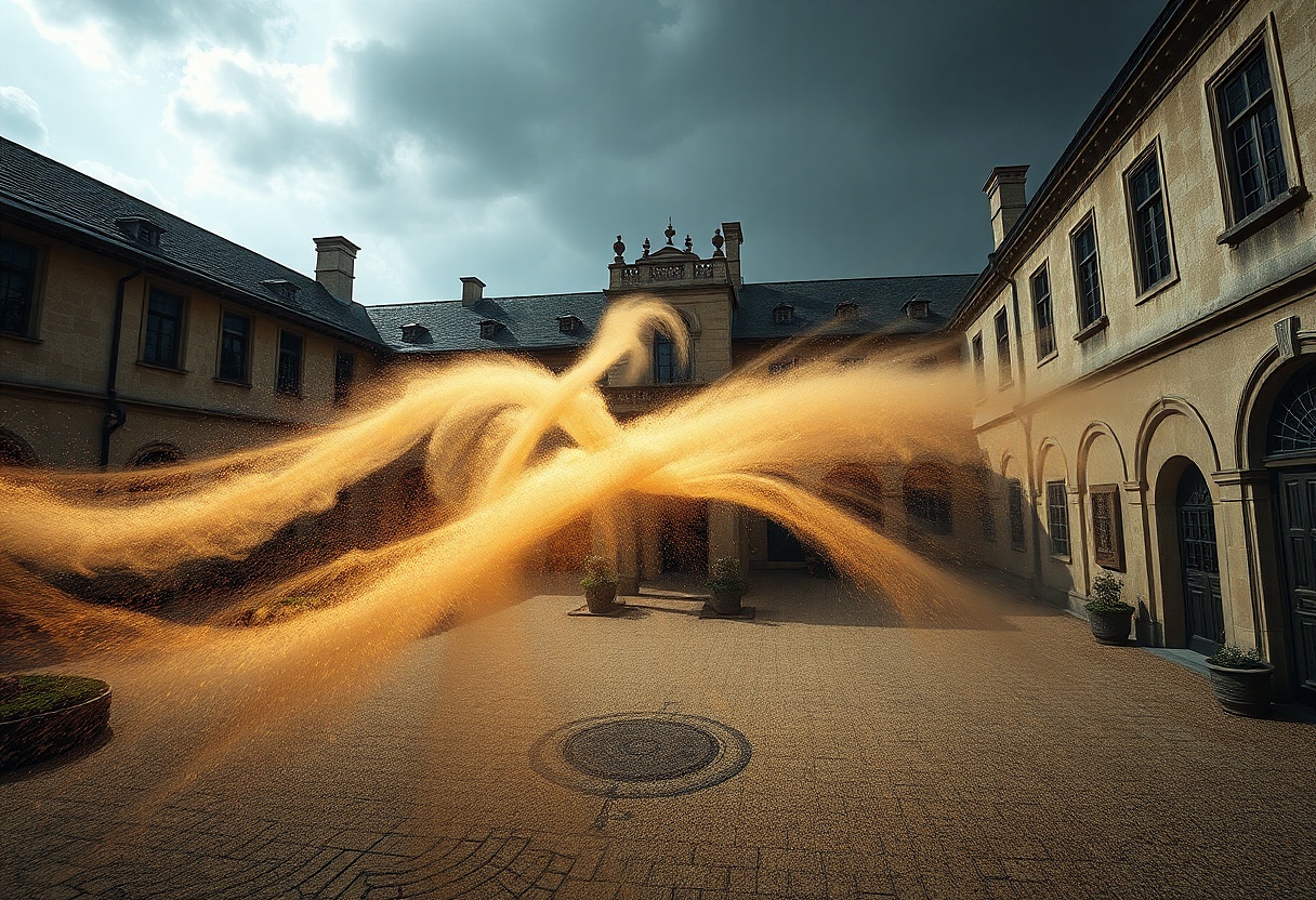 „Uragán bohyně Alveny,“ odpověděl nevzrušeným tónem Ezechiel stojící uprostřed dvora. „Taky v Konodii poměrně vzácný jev, protože bohyni patřičně uctíváme. Ale za Šerým mořem řádí běžně.“