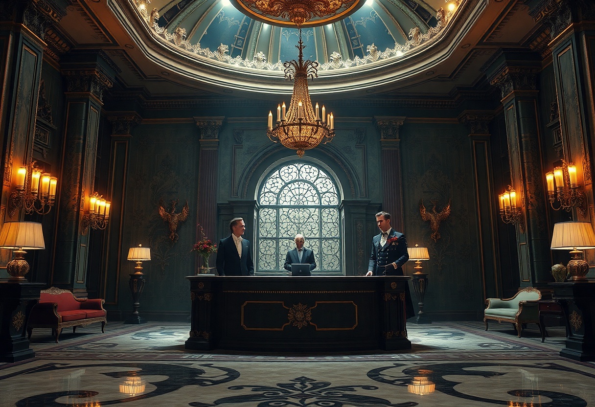 Vstoupili do ohromné sloupy podepřené vstupní dvorany. V jejím středu se za kulatým pultovým stolem v nepřetržité službě střídali tajemníci z rasy bahenních běsů. Jednalo se o potomky boční větve vyvražděné vládnoucí linie z Po-ovikanu. Všichni se narodili v zajetí a byli vychováváni k absolutní oddanosti císaři.