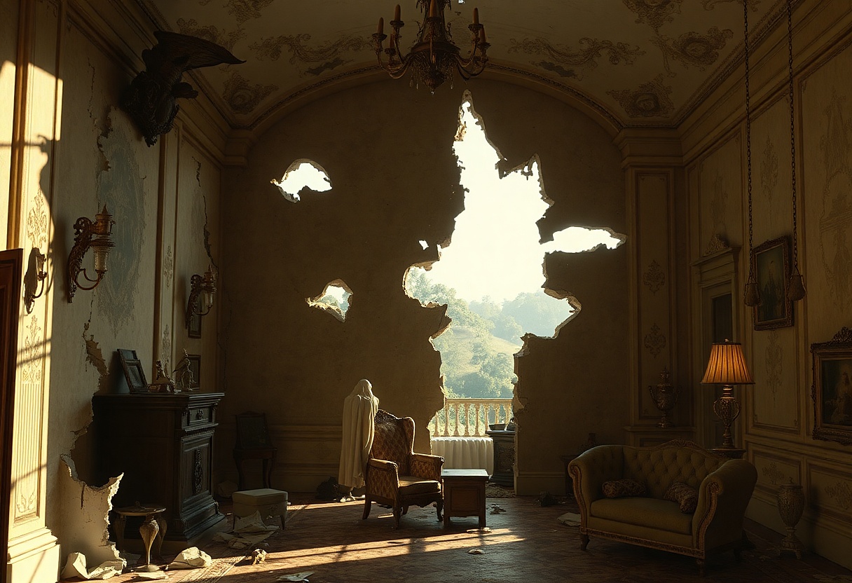 Strýc rázoval po omítkou poprášeném temně modrém koberci a máchal rukama. Všude ležely ruiny. Zřícené zdi a stropy otevíraly nové průhledy do zákoutí Urvalova bytu.