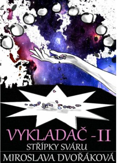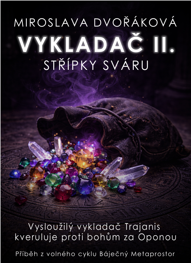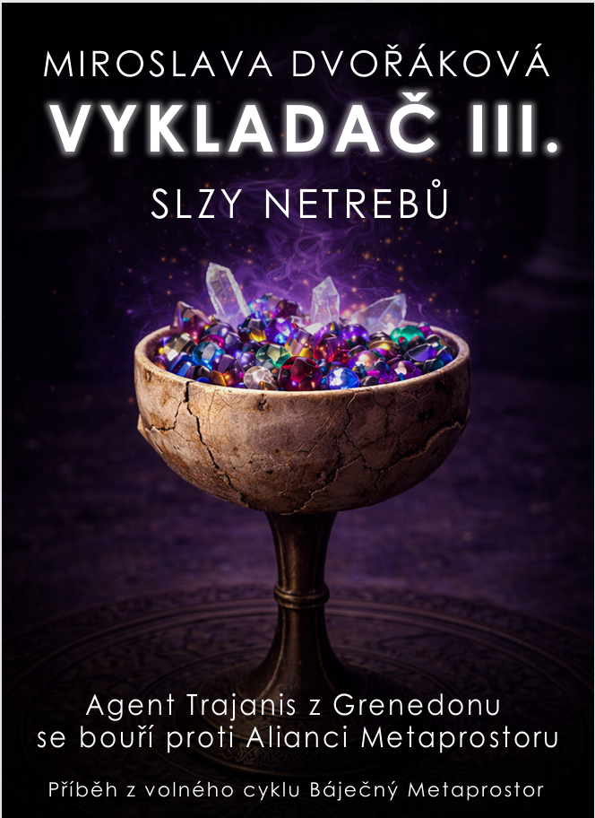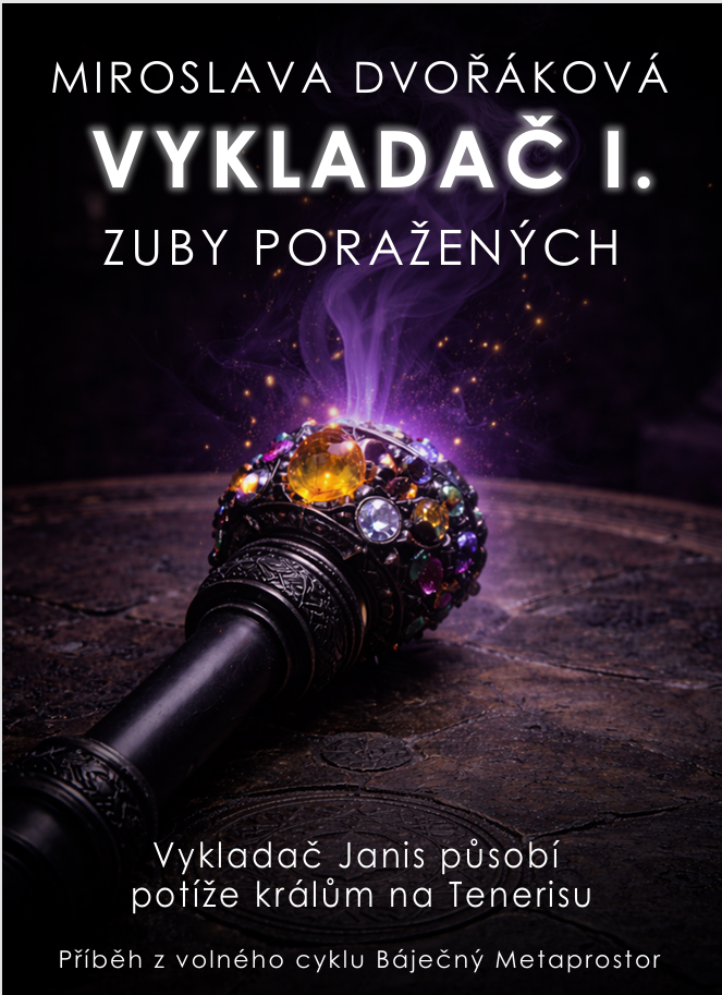 První vydání Vykladače realizovalo nakladatelství Nová vlna v roce 2017. Futuristické a extravagantní obálky všech tří e-booků nakreslila naše dcerka v dobách, kdy na střední studovala grafiku. Protože jsem od té doby napsala hromadu dalších knih z volného cyklu Metaprostor, jejichž děj s příběhem Vykladače volně souvisí, došla jsem k závěru, že Vykladač si zaslouží nové vydání. Trilogie potřebuje doplnit data v přílohách. V rejstříku postav a reálií přibudou hesla propojující Vykladačův příběh s dalšími příbehy a historií světů Metaprostoru. V soupisu vydaných knih přibudou kousky napsané po roce 2017 (Sarvonův odkaz, Z(a)tracené klíče). Stejně tak budou doplněny anotace. A především pro mě Anna Marie přichystala nové šmrncovní obálky. Nejdříve jsme zamýšlely na obálky umístit magické artefakty, které Trajanis používal. Na obálce prvního dílu mělo být žezlo Hiria abhama, druhý díl měl zobrazovat střípky sváru jako broušené krystaly, třetí díl ukazoval tytéž krystaly nasypané v Larionině poháru. Poslala jsem návrhy nakladateli Martinu Koláčkovi. Napsal mi, že drahokamy jsou fajn, ale dlouholetá praxe mu potvrzuje, že figurální motivy s ústředními postavami jsou pro čtenáře mnohem atraktivnější. Tak jsme se s Aničkou pustily do dalších návrhů. Ještě to chce trochu doladit, ale myslím, že to bude dobré.