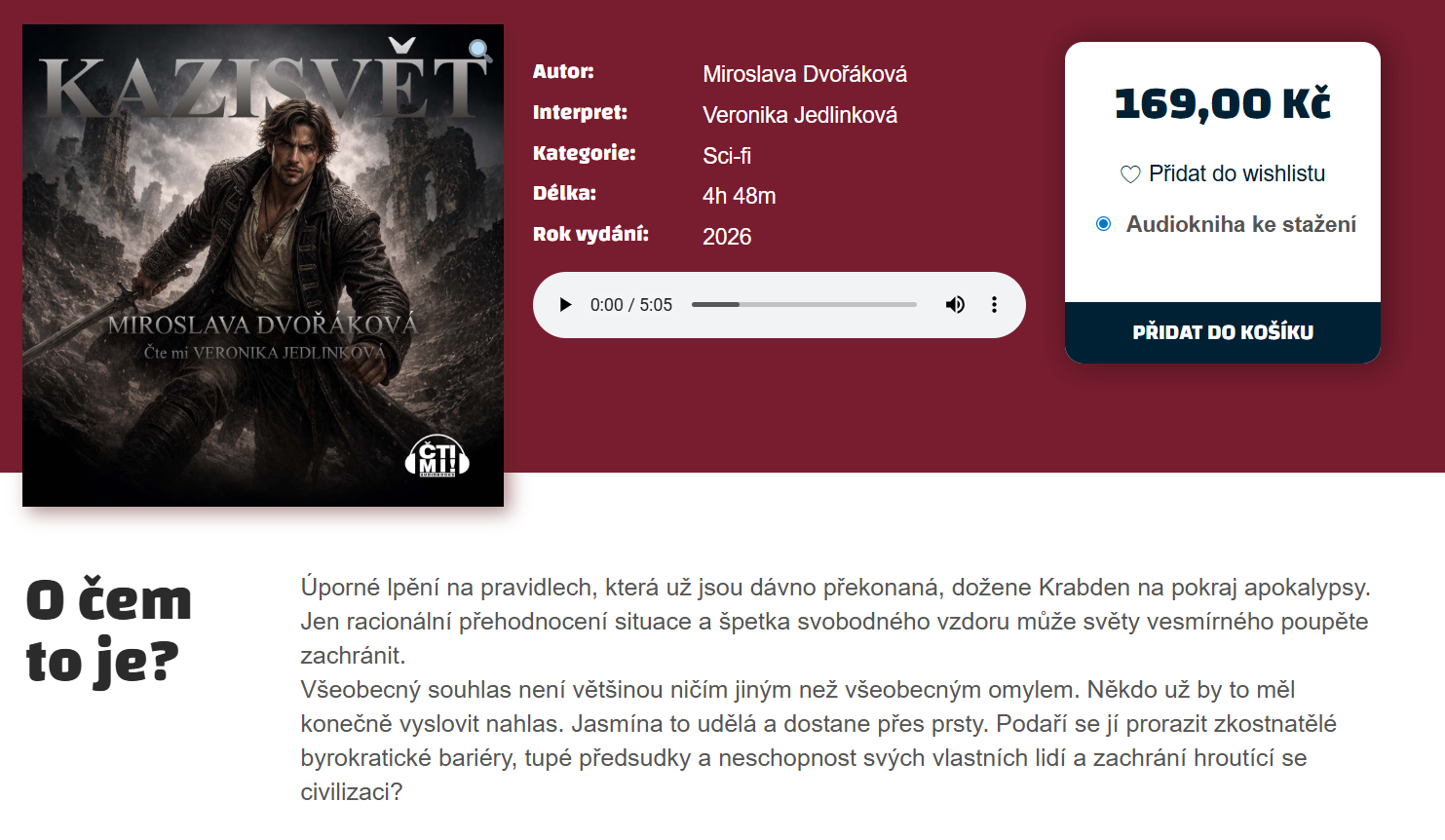 Radostně hlásím, že audiokniha "Kazisvět" spatřila světlo světa. Fenomenálně ji načetla Veronika Jedlinková.