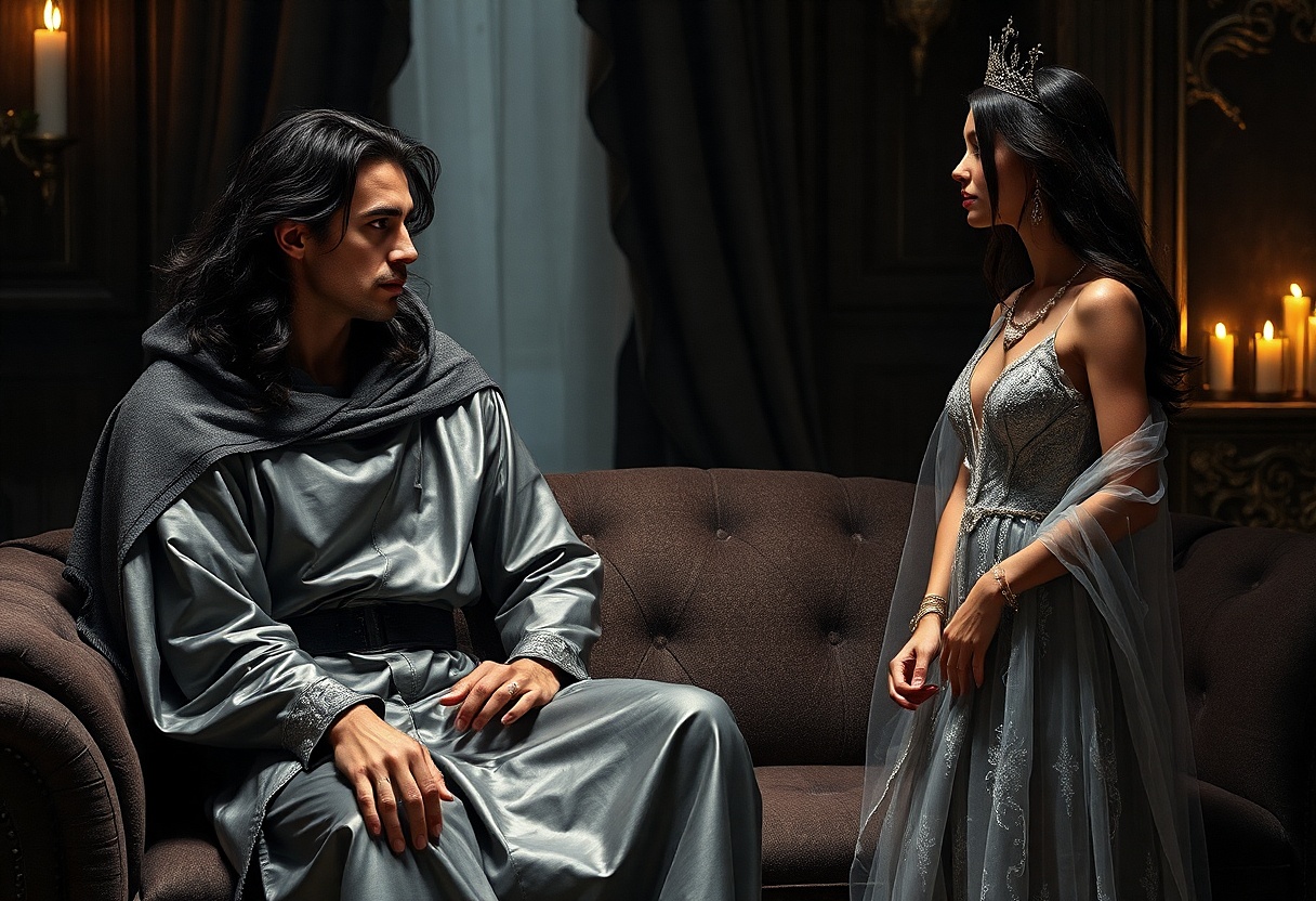 Zavedl ji do šatny. Otevřel skříň a vylovil jeden z mnoha tyrkysových sametových plášťů. Vybral model s černou matně se lesknoucí podšívkou a s kapucí, aby mohla skrýt ty nádherné havraní kučery. Obrátil plášť naruby, a místo modrého získal černý. „Šaty a boty dej sem,“ řekl a ukázal na velkou brokátem potaženou škatuli, ve které spočíval jeho obřadní klobouk. Obleč si toto,“ podal jí plášť, aniž by se na ni podíval. Budiž jí ke cti, že neřekla ani slovo. S kápí spuštěnou do obličeje připomínala postavu ze špatné divadelní hry. Než seženou něco lepšího, musí to stačit. Rawen otevřel okno, vyklonil se, aby zkontroloval, jestli je vzduch čistý.