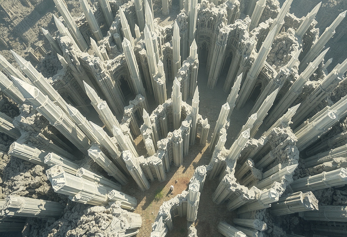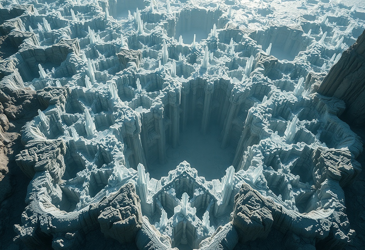 Znovu zaměřil pozornost na petrofionty tam dole. Jako kdyby přes hory a doly někdo rozhodil krajkovou záclonu a různě si shrnul a zpřehýbal. Větvení minerálních trámců působilo na první pohled křehce, ale spojené v síti fungovalo nezvykle stabilně. Z pravidelně se opakujících geometrických vzorů občas vyšlehla sprška temně modrých jisker.