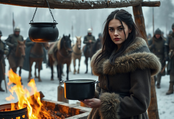 Děvčata se smíchem sundala rukavice a čepice a sklonila se k balíku se zásobami. Vybalila pecny chleba a klobásy a s lechtivými průpovídkami je vojákům vydávala k obědu. První byla moc hubená, šilhala a krákorala jako vrána, ta druhá s kulatým mastným poďobaným obličejem a řídkými vlasy se pohybovala jako stelná bachyně. Vojákům, zdá se, to nevadilo. Mezitím přestalo ohniště dýmit. Matrona v kožichu rozložila nad ohništěm trojnožku a zavěsila nad plameny kotlík se sněhem. Ta čtvrtá ženská navlečená v hnědém plášti podala medvědici měch s vínem. Matrona si trochu lokla, zaškaredila se a hned na tu modrou spustila: „Řikala sem, ať vezneš druhý měch zprava, ty nerédo! Loriberské růžové! Teho je na svařák škoda!“