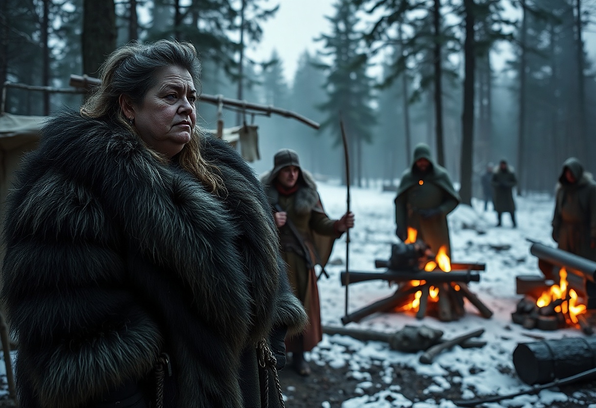 Děvčata se smíchem sundala rukavice a čepice a sklonila se k balíku se zásobami. Vybalila pecny chleba a klobásy a s lechtivými průpovídkami je vojákům vydávala k obědu. První byla moc hubená, šilhala a krákorala jako vrána, ta druhá s kulatým mastným poďobaným obličejem a řídkými vlasy se pohybovala jako stelná bachyně. Vojákům, zdá se, to nevadilo. Mezitím přestalo ohniště dýmit. Matrona v kožichu rozložila nad ohništěm trojnožku a zavěsila nad plameny kotlík se sněhem. Ta čtvrtá ženská navlečená v hnědém plášti podala medvědici měch s vínem. Matrona si trochu lokla, zaškaredila se a hned na tu modrou spustila: „Řikala sem, ať vezneš druhý měch zprava, ty nerédo! Loriberské růžové! Teho je na svařák škoda!“