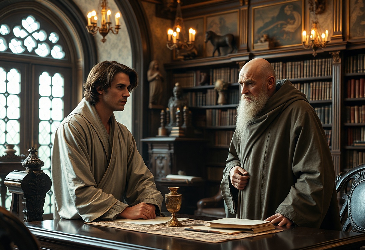 Po hodině to s těžkým povzdechem utnul a odebral se na lože. Nezbude mu, než se do kláštera vypravit osobně. Alespoň ho to odvede od myšlenek na přízrak v jeho pokoji. Pokud existuje racionální vysvětlení, najde ho. Podívá se tomu „bubákovi“ na zoubek. Mnichy, přirozeně, nechá v dojmu, že se mu to podařilo díky Krassionině radě.
