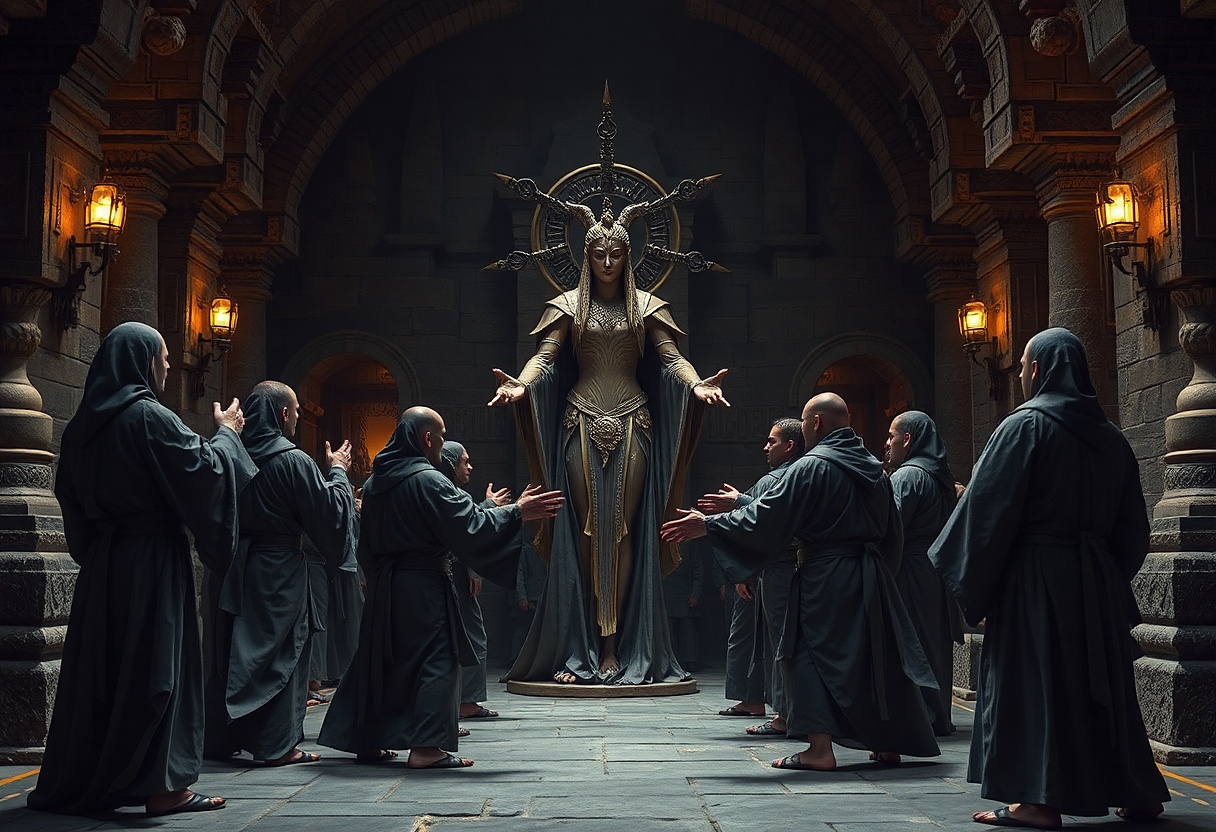 Jeden po druhém dopadli do začouzené haluzny a porazili několik kvílejících smrtelníků navlečených v šedivých hábitech. Zřejmě přerušili nějakou hudební produkci, ale znělo to tak teskně, že ticho, které se po jejich příchodu rozhostilo, bylo úlevou pro uši. Uprostřed na kruhovém podiu se tyčil vysoký tlustý chlap temné pleti a cosi svíral v napřažené pěsti. Před ním stál kamenný stůl, na kterém se s křečovitými záškuby svíjelo hubené a bledé lidské tělo. Za nimi na vysokém trůnu seděla žena navlečená do mnoha vrstev barevného lesklého šatstva, s účesem zdobeným zlatem a drahokamy, který musel zabrat hodiny. I zdálky bylo patrné, že její obličej je silně nalíčený. Pokud by se usmála, barva by se začala loupat. „To je klarivijská princezna Jitrena, kněžka podsvětní bohyně Exis,“ šeptl šokovaně Rawantes. „Narušili jsme obnovovací ritus.“