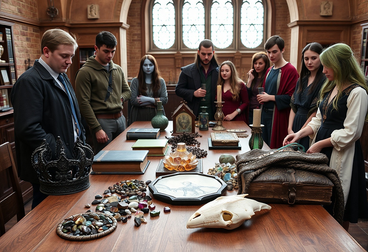 Pozornost budila těžká poškozená koruna upletená z kovových prutů. Materiál byl rozpukaný a drsný, jako kdyby na něj trvale působilo nějaké agresivní prostředí. Kolem koruny se mihotala jasně modrá ochranná clona. Navzdory stínění z té věci prosakovala magie, kterou Viola vnímala jako nepříjemné svědění za krkem. Koruna ležela úplně na kraji stolu. U ostatních předmětů se studenti přetlačovali, ale kolem koruny bylo volno. Viola vykročila, aby se na ni podívala zblízka, ale Qadren ji chytil za ramena a varovně zasyčel.