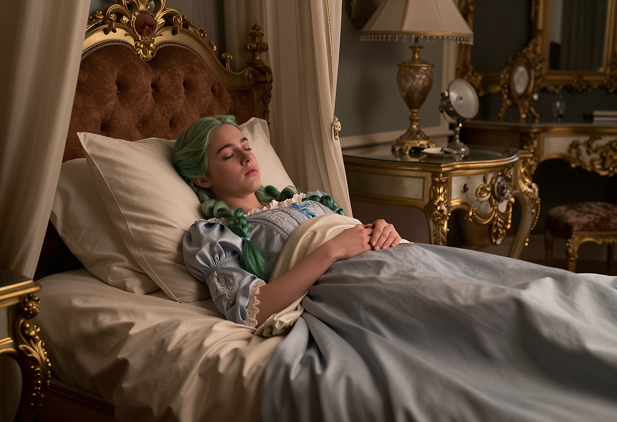 Až teď si všimla, jak nedostatečně je oblečená. Kdyby ji v takové parádě uviděla prateta, nepromluvila by s ní do dalšího Květinkového plesu. Aby se Viola riziku vyhnula, ignorovala dlážděnou a často používanou širokou cestu podél obvodové zdi. Minula úzkou, pískem sypanou pěšinu, vinoucí se kolem altánu k rozáriu, a namířila si to skrze ňavamový sad ke stájím a skladům. Prokličkuje mezi technickými budovami ke kuchyni, a postranním schodištěm se nepozorovaně vrátí do svého patra.
