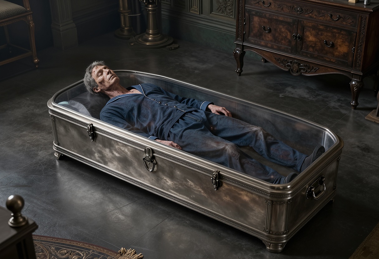 Grenedonovy pokoje byly o patro výš než ty její. Myslela, že bude v ložnici, ale našla ho v saloně. Ležel v kovové bedně pod průhledným víkem. Z ošuntělého temně modrého hábitu byla vidět jenom tvář, kterou brázdily tenké vrásky. Takové Viola vídala u smrtelných obyvatel Bredeonu, kteří zestárli. Jeho kůže byla šedivá a téměř průsvitná. Na kůži se rýsovaly drobné čevenohnědé flíčky, a na vyhublé tváři rašilo řídké šedivé strniště. Jeho rty byly tenké a popraskané.