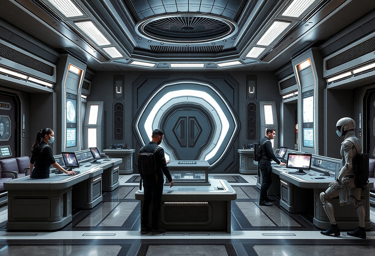 „Vítejte ve velícím středisku Aliance, v budově Q,“ řekl jim důstojník, jakmile vystoupili z výtahu. Uvedl je do velkého sálu, jehož průhledné obvodové stěny umožňovaly vyhlídku na kamenitý venkovní terén základny. Interiér připomínal rušné nádraží. Prostor členily sloupy gravitačních zdviží, byly zde pulty, kolem kterých se činili dispečeři. Někteří měli na hlavách komunikační přílby, další se věnovali agentům, kteří přicházeli s hlášením. Na rozměrných panelech blikaly nápisy v dwentenštině, zjevně informující o aktuálním průběhu sledovaných událostí na různých světech Metaprostoru.