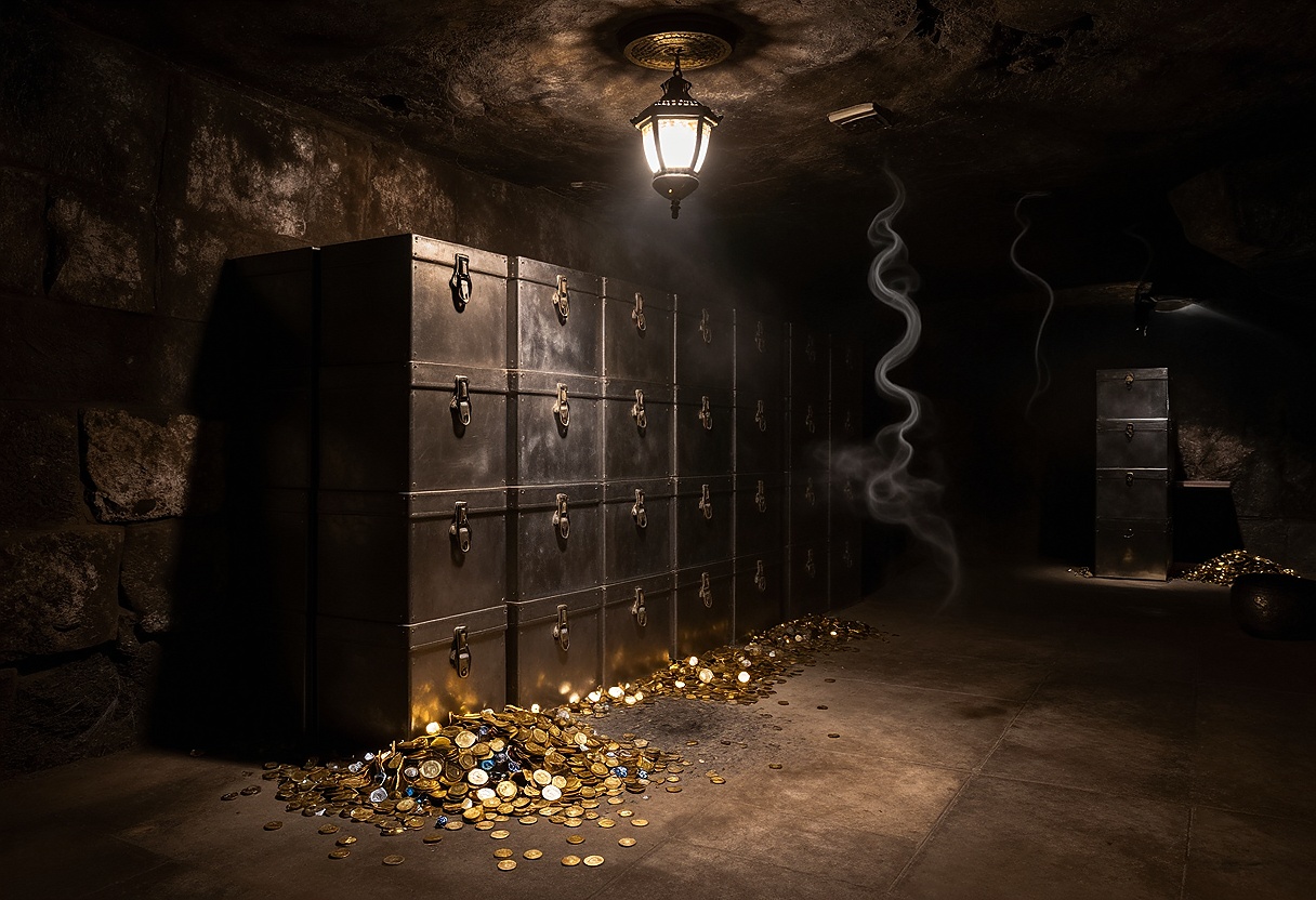 Její smysly se vracely k normálu. Vyškrábala se na nohy a rozhlédla se. Nacházela se uprostřed závěje mincí, a klenotů, v nějaké podzemní pokladnici. První dojem nepořádku popíraly pravidelně vyskládané bedny s mosaznými štítky, které jako obrovské cihly vytvářely stěny, stojící v osmi řadách. Uličky mezi stěnami tonuly v šeru, ředěném přízračným světlem jediné vysoko zavěšené vodní lampy.