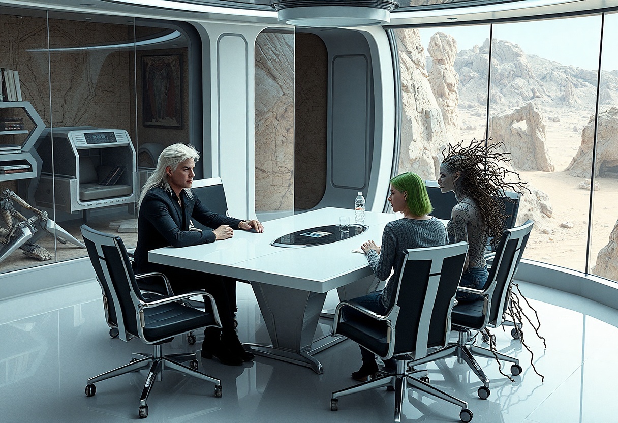 Uvnitř kolem velkého stolu se židlemi postávali Hedis, Aderawen, a další ženy a muži s černými kamínky v uších. Na jedné ze židlí seděla žena s modrozelenou pokožkou a drdolem spletených černých vlasů vyčesaných tak, že odhalovaly zátylek, ze kterého koketně povlávalo orientační tykadlo. Dervosanka. To musí být Třetí z Triády, Anaera Assi-Siona. Za jejími zády stál chlap v přiléhavém bílém trikotu se zelenýma očima a bledou kůží a krátkým kaštanově zbarveným porostem na hlavě. V obočí se mu blýskaly kovové kroužky a jeho krk zdobil stříbrný obojek. Vypadal jako šperk, ale stejně jako kroužky v obočí vrůstal do mužova těla. Skoll Tanasi Uneon v plné síle. Janisovu pozornost ale zaujala postava zahalená v dlouhém sametovém černém na zem splývajícím plášti s bílými vlasy otočená k obyčejné dvourozměrné mapě zachycující rozmístění Nouzových záchytných bodů v Metaprostoru.