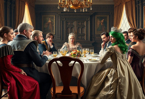 Společnost u královniny tabule byl obdobná jako minule, přibyl jen princ Hasirian. Stromista zaujal místo vedle Klarisy a princ Ginian, který předtím seděl na opačném konci stolu, se teď přesunul na místo po Hasirianově pravici. Ti dva k sobě každou chvíli naklonili hlavy a cosi si důvěrně špitali. Vypadalo to, že se jeden vedle druhého cítí pohodlně. Zato Eryn, která seděla na místě, které minule zaujal její bratr, opět vibrovala nevolí. Janis si pobaveně všiml, že své nepřátelské projevy diferencuje. Na někoho se mračila méně a na někoho více. Celkově připomínala hodně špatně naloženou dračici, ačkoliv se brůss Nidi-An i admirál Zefirien snažili, seč jim síly stačily, aby ji nějak rozptýlili.