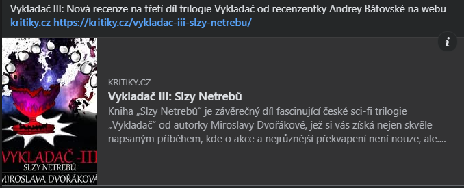 8. dubna 2025 vyšla nová recenze na třetí díl série Návrat na Mizeon: Essius kritiky.cz/essius-3-dil-serie-navrat-na-mizeon/